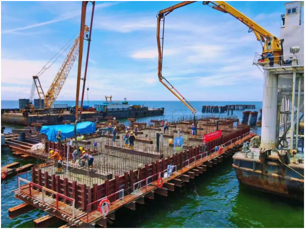 2024年3月3日,中交马来西亚公司沙巴ZLNG码头项目主平台700立方米大体积混凝土浇筑工作圆满完成,标志着项目主体结构施工进程行至关键里程界标。