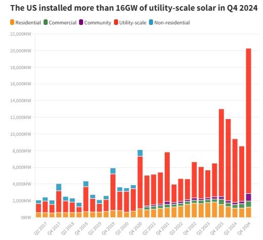 然而,报告也指出了一些挑战。尽管美国的组件制造能力同比增长190%,到2024年底达到42.1GW,并在2025年初增加到50GW以上,但制造业的上游部分表现不佳,美国仅有2GW的晶体电池制造能力。此外,尽管有《通胀削减法案》(IRA)等政策支持,但新政府带来的不确定性将抑制对新投资的兴趣。SEIA和Wood Mackenzie预计,美国太阳能行业的增长将出现萎缩,2024年创下的历史新高将不可持续。在公用事业规模领域,2024年第四季度新增产能同比下降17%,预计这一势头将持续下去。分布式领域也有类似的趋势,报告预计商业安装量和社区安装量在未来几年将出现下降。