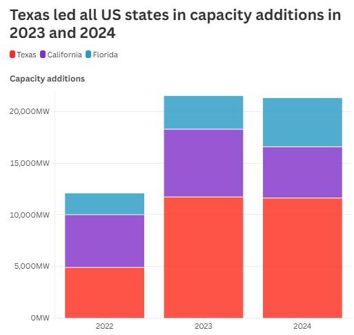 报告指出,德克萨斯州、加利福尼亚州和佛罗里达州自2022年以来一直占据年度新增装机容量的前三名。其中,德克萨斯州在2024年继续呈指数级增长,年度新增装机容量从2022年的4,898兆瓦跃升至11,728兆瓦,是加利福尼亚州2024年新增装机容量4,961兆瓦的两倍多。与此同时,佛罗里达州也连续第三年新增装机容量,尽管其累计太阳能总容量约为加利福尼亚州的三分之一,但这些州的变化速度引人注目。此外,一些太阳能产业规模较小的州也受益于持续的产能增加,如俄亥俄州、阿肯色州、密西西比州和路易斯安那州等。