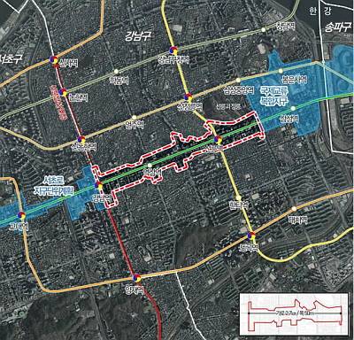目标区域位于德黑兰路沿线,从江南历史路口至POSCO路口。这一地区交通便利,拥有地铁2号线、新盆唐线、GTX-A·C线及城际巴士等多种交通方式,同时配备了完善的生活基础设施。自2009年区域单位计划重组以来,该地区在基本城市规划中被升级为“市中心”,已成为首尔具有代表性的全球商务和商业功能区。