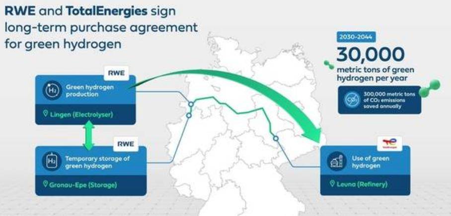 为了实现其2030年欧洲炼油厂使用的氢气脱碳的目标,TotalEnergies与德国开发商RWE签署了一项协议,从2030年开始,在15年内向德国Leuna炼油厂供应3万吨/年的绿色氢气。