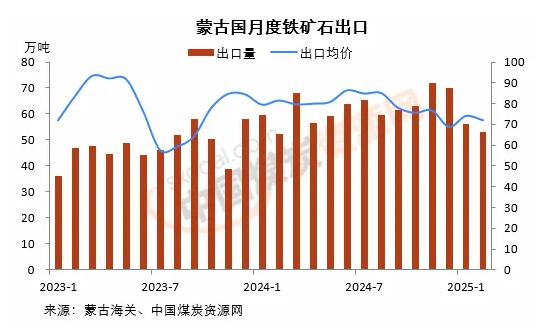 蒙古国海关总署发布最新数据显示,2025年2月份,蒙古国铁矿石出口总量为53.16万吨,同比增加0.70万吨,增幅1.33%;环比减少2.91万吨,降幅5.19%,环比连续第三月下降。