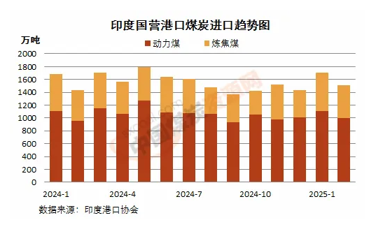 本财年前11个月(2024年4月-2025年-2月),印度国营港口共进口煤炭1.7亿吨,同比下降2.89%。其中,进口动力煤1.16亿吨,同比微增0.43%;进口炼焦煤5395万吨,同比下降9.35%。