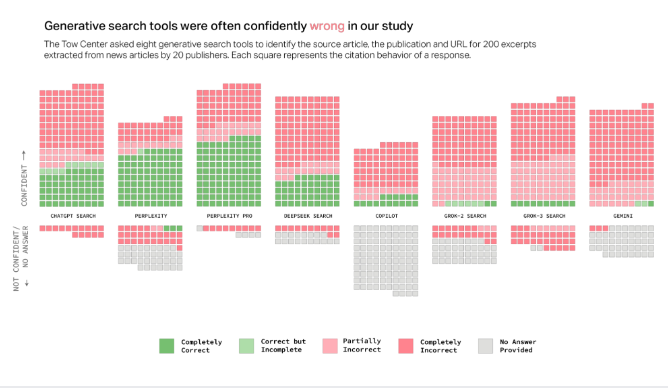 《哥伦比亚新闻评论》(CJR)的 Tow 数字新闻中心研究显示,AI 搜索引擎在新闻引用准确性上表现堪忧,错误率超 60%。研究测试了 ChatGPT Search、Perplexity、Gemini、DeepSeek Search、Grok 3 等八款 AI 搜索工具,发现其错误回答新闻来源查询的比例高达 62%。研究人员 Klaudia Jaźwińska 和 Aisvarya Chandrasekar 指出,约 25% 美国人使用 AI 搜索替代传统搜索引擎,高错误率引发可靠性担忧。Perplexity 错误率最低(37%),ChatGPT Search 为 67%,Grok 3 最高(94%),显示工具间表现差异显著。