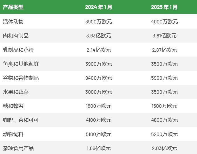 2025 年 1 月,对北爱尔兰的食品和活体动物出口与 2024 年 1 月相比有所下降,从 1.65 亿欧元降至 1.47 亿欧元;而进口方面,价值从 1.06 亿欧元增加到 1.25 亿欧元。