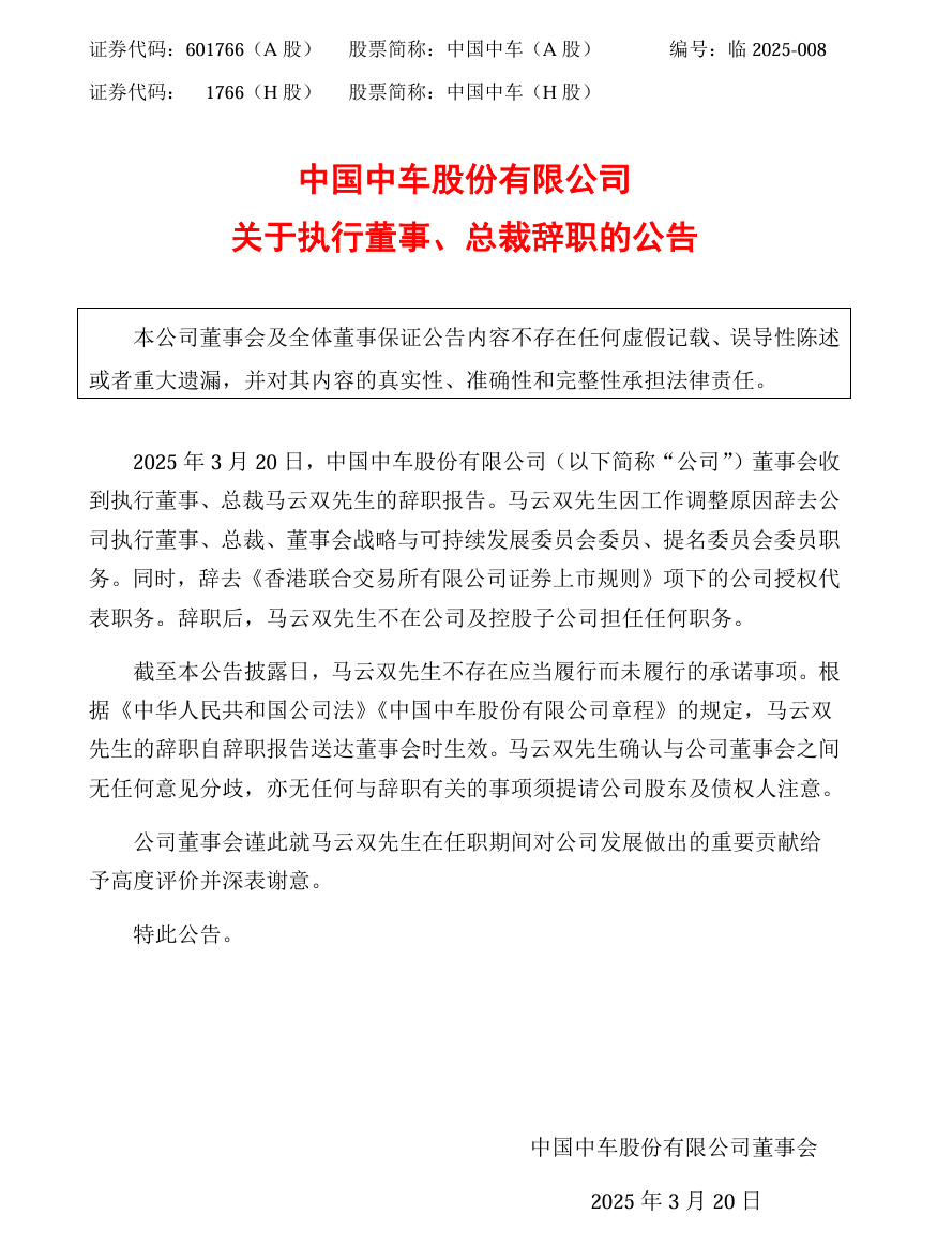 中国中车发布公告称,3月20日,公司董事会收到执行董事、总裁马云双先生的辞职报告。马云双先生因工作调整原因辞去公司执行董事、总裁、董事会战略与可持续发展委员会委员、提名委员会委员职务。同时,辞去《香港联合交易所有限公司证券上市规则》项下的公司授权代表职务。辞职后,马云双先生不在公司及控股子公司担任任何职务。
