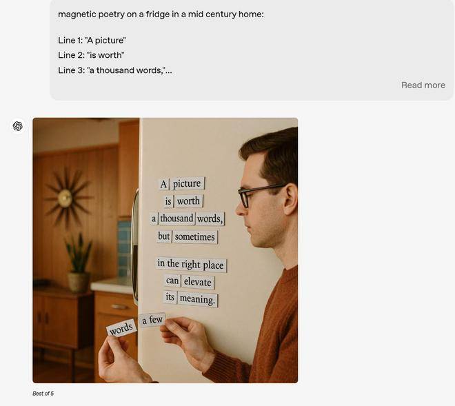 在周二的直播活动中,这家总部位于旧金山的公司展示了ChatGPT用户如何通过与聊天机器人进行一系列对话来优化图像。据该公司称,ChatGPT还将能够更好地创建具有连贯文本的图像,使其更擅长为专业用途提供图表、信息图表和徽标。ChatGPT已经能够大致准确地按照提示词,生成图像中的文本。在演示中,AI成功按照要求生成一整页的讲话文本,同时没有出现错别字。例如,一个人可能会提示聊天机器人生成自定义菜单或地图的逼真图像。该公司表示,它还将能够执行用户关于图像构图的更复杂的指令。