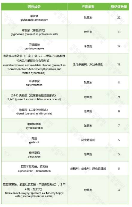 2024年批准的有害生物防治产品共涉及100余种活性成分,登记数量位居前列的活性成分如下。其中,草铵膦的登记数量最多,成为了加拿大该年度登记最热门的活性成分之一。