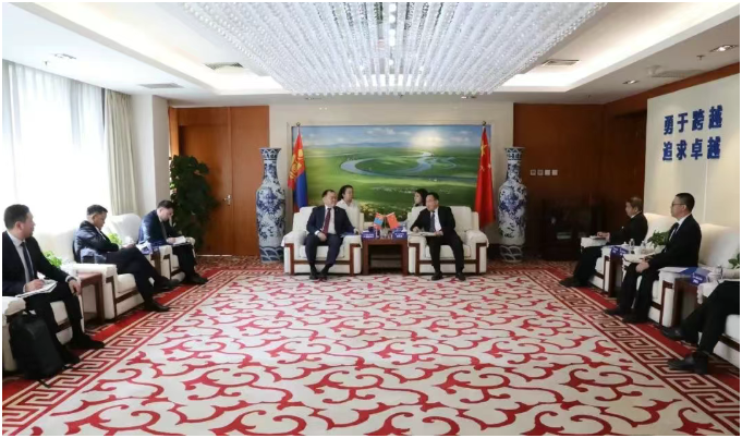 3月28日,集团公司党委书记、董事长鲁和友,与来访的蒙古国第一副总理冈图木尔一行举行会谈,双方就加强在蒙古国矿产资源开发和基础设施建设等领域合作进行深入交流。