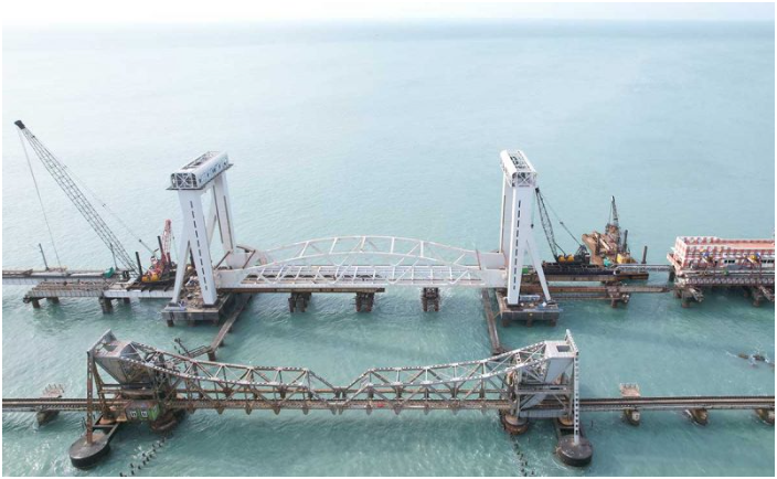 新帕姆班大桥全长2公里,横跨印度与斯里兰卡之间的保克海峡,将大陆与帕姆班岛上的拉梅斯瓦拉姆镇紧密相连。该桥取代了始建于1914年的旧堤道,旧桥原定于2022年关闭。新桥的设计独具匠心,其跨度中设有一个双开合桥结构,与伦敦塔桥的设计理念有相似之处。