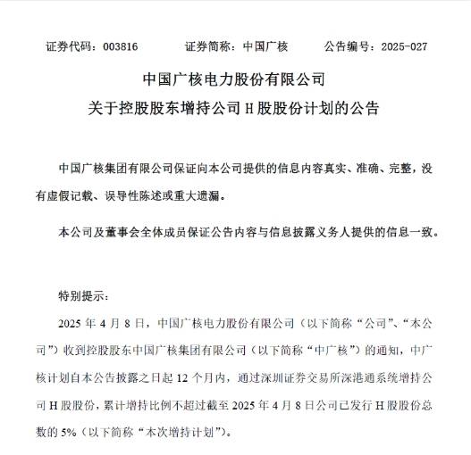 中国广核集团有限公司基于对中国经济长期平稳向好的坚定信心,践行“国之大者”使命,持续积极履行控股股东责任,截至2024年12月31日,已连续累计增持中广核电力H股股份超5.6亿股,彰显了对中广核电力的长期信心,传递上市公司的长期价值。2025年4月8日,中国广核集团有限公司再次启动对中广核电力H股股份的增持计划。目前,中广核电力(003816.SZ/01816.HK)已公告增持计划。