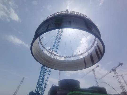 本次吊装的SC8-10层模块是4号机组体积最大模块,由3层近40个子模块拼装而成,整体呈圆筒型,外径约45米,高约10米,吊装总重量超过800吨。