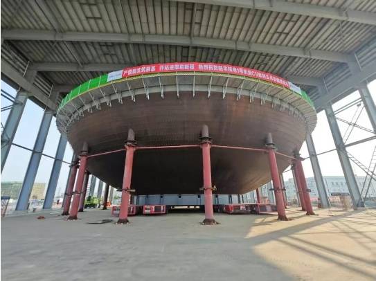 钢制安全壳是核岛的安全屏障,整个钢制安全壳由底封头、4个环段以及顶封头共6个部分拼装而成。与“华龙一号”机组不同,钢制底封头为CAP1000机型特有设计,本次吊装的CV底封头呈半球状,高11.4米,最大内径39.6米,吊装总重量约843吨。