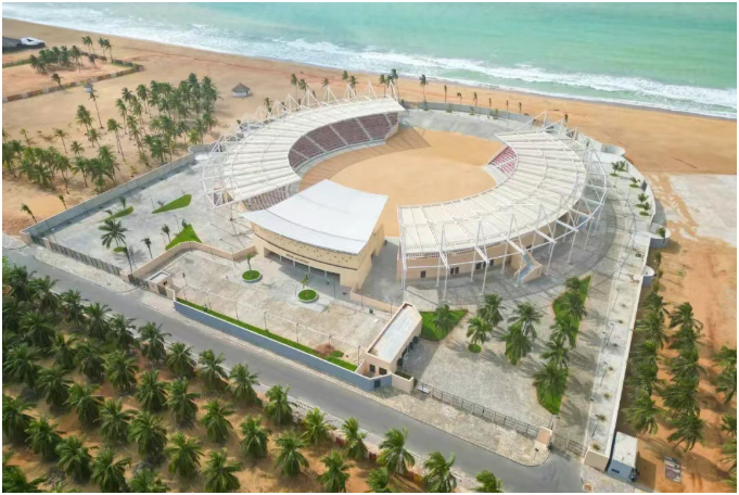 维达海滨项目作为贝宁国家级旅游综合体开发项目,是贝宁文化旅游的重点工程,坐落于贝宁维达市海滨区“不归门”及周边地区。项目总占地面积20.25公顷,主要包括主题酒店区、手工艺村、圆形剧场三个核心区域,涵盖住宿、餐饮、商务、会议、休闲娱乐、景观游览等功能。项目于2021年6月开工,建成后将成为代表贝宁文化和历史的一张名片,为当地社会经济发展发挥积极作用。目前,圆形剧场、道路、停车场已基本完工,进入预验收阶段,手工艺村和人工湖水利系统正在进行收尾工作,酒店区主体结构全部完成,进入装修安装阶段。