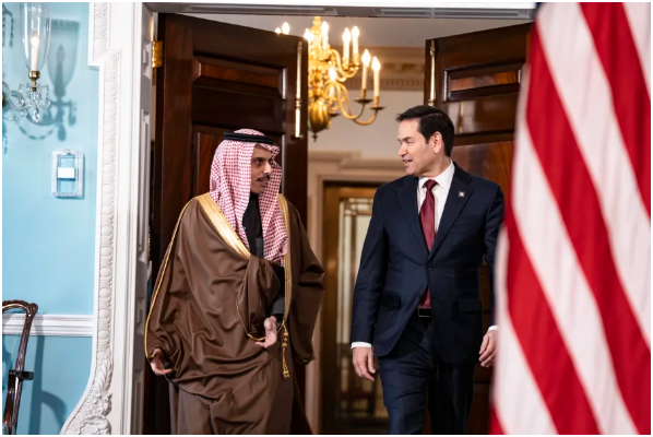 2025年4月9日,美国国务卿卢比奥在华盛顿特区美国国务院会见沙特外交大臣费萨尔·本·法尔汉·阿勒沙特。图片来源:Andrew Thomas via Reuters Connect