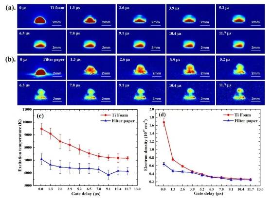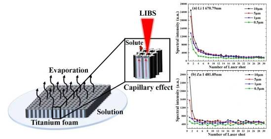 针对以上问题,原子能院激光光谱研究团队提出毛细效应增强激光诱导击穿光谱新方法。该方法以多孔泡沫钛作为富集基底,将泡沫钛浸泡在溶液中,利用毛细力自驱动作用,使溶质随溶液沿微孔向上迁移并在基底表面富集。研究结果表明,采用泡沫钛基底进行溶质富集后,溶质在基底表面均匀分布,“咖啡环”效应得到有效抑制。与传统滤纸基底相比,采用泡沫钛基底富集后,激光诱导等离子体演化稳定性显著提升,等离子体温度、电子密度同步提高,等离子体辐射光谱强度显著增强。