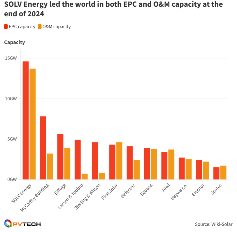 根据榜单,就EPC装机容量而言,排名前三的公司是:SOLV Energy、 McCarthy和Eiffage,与去年相比仍保持在前三的位置,但第四和第五的位置已被印度的Larsen & Toubro和Sterling&Wilson占据。