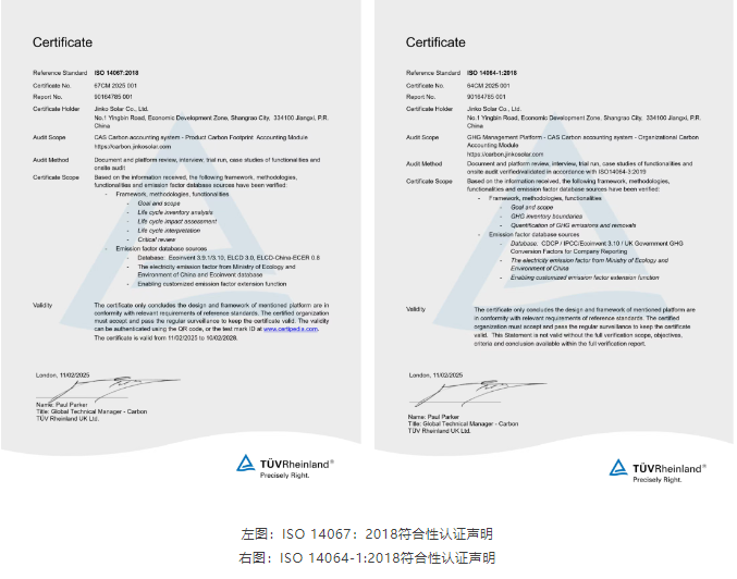 近日晶科能源碳管理系统成功通过德国莱茵TÜV集团(以下简称TÜV莱茵)的符合性认证,成为光伏行业首家获得ISO 14064-1:2018和ISO 14067:2018标准认证的企业。此次认证不仅是对晶科碳管理系统先进性的高度认可,也标志着晶科在低碳发展道路上迈出了关键一步。在全球碳中和目标的推动下,晶科能源凭借在碳管理领域的卓越创新和实践,再次树立了行业新标杆。