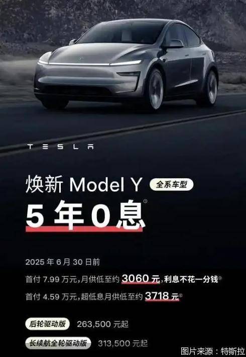4月22日,特斯拉中国宣布,焕新Model Y车型首次推出5年0息政策,6月30日前,购车首付7.99万元,月供低至约3060元。同时,Model 3推出限时8000元保险补贴,后驱/长续航版叠加5年0息,月供低至约2460元。