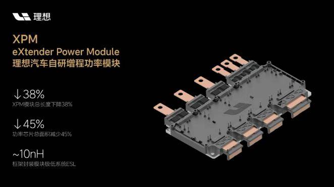 XPM(eXtender Power Module)功率模块是理想汽车历时3年研发打造的增程专用二合一功率模块,围绕XPM相关技术,已完成超过50件专利布局。该产品通过5大类核心技术创新实现了功率模块性能指标行业领先,不仅可以助力增程电驱动系统以更优异的成本实现极致的关键技术指标和系统收益,也可以扩展应用到其它采用双电机控制器的混合动力系统。在模块开发中,理想汽车还首次运用了中车第7.5代超精细沟槽IGBT芯片先进技术,并基于其多场景封装测试平台验证了该功率模块出色性能,实现了行业领先的产品力。
