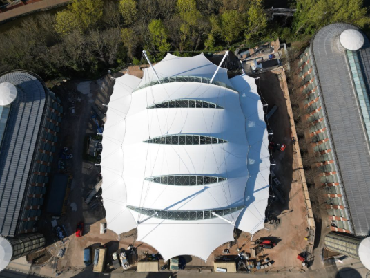 近日,英国中部地区承包商GF Tomlinson成功完成诺丁汉大学Castle Meadow校区标志性二级保护建筑——中央大楼的屋顶翻新工程。作为全面改造计划的核心环节,项目团队将原有聚四氟乙烯(PTFE)屋顶替换为新一代PVDF织物张拉结构,在延续建筑历史价值的同时提升其现代化功能。