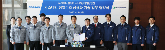 4月24日,斗山能源与HD现代船用发动机公司在斗山能源昌原总部举行签字仪式,正式签署关于开发燃气轮机精密铸造制造技术的谅解备忘录(MOU)及叶片材料原型生产合同。斗山能源电力服务BG部长Son Seung-woo(孙承宇)与HD现代船用发动机公司代表Kang Young共同出席了此次仪式。