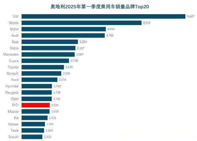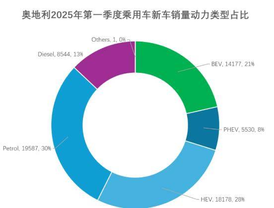 据报道今年6月起,小鹏和广汽将在奥地利的麦格纳斯太尔工厂采用SKD(半散件组装)模式组装汽车。我们来看看奥地利本地汽车市场情况。2025年第一季度乘用车累计销量同比增长6.7%,达到40,067辆。从动力类型的市场结构来看,汽油车占比最大为30%,HEV占到28%,电动车(BEV+PHEV)市场占比达到29%。