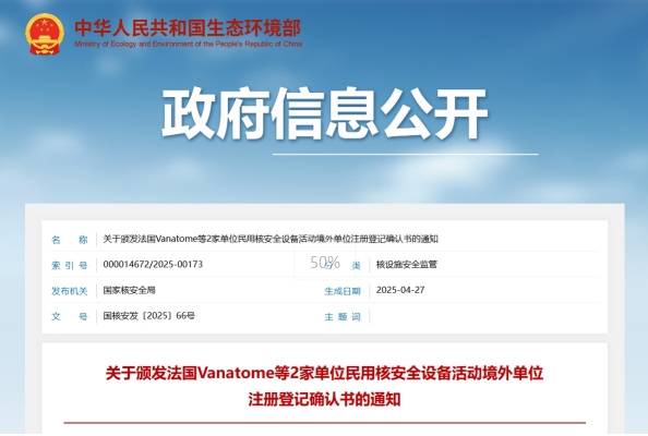 关于颁发法国Vanatome等2家单位民用核安全设备活动境外单位注册登记确认书的通知