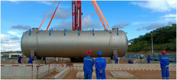 4月23日上午,随着吊装指令的下达,刚波夫项目液体二氧化硫储罐在现场施工人员的紧密配合下稳稳吊起,并顺利完成初次定位安装,标志着该项目二氧化硫系统正式进入设备安装阶段。