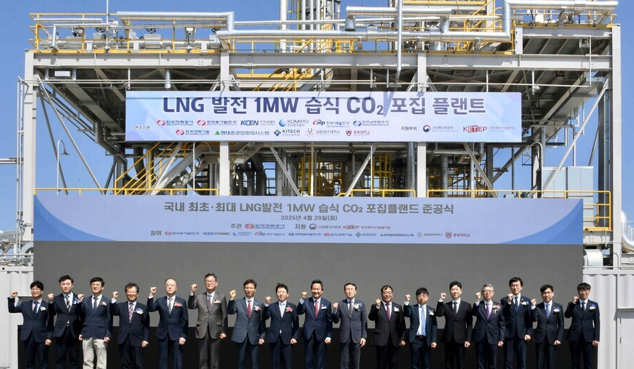 4月29日,韩国电力在蔚山广域市韩国东西电力蔚山发电厂本部举办了韩国首个且规模最大的“LNG发电1MW湿式二氧化碳捕集成套设备”竣工仪式。蔚山广域市、韩国东西电力公司、韩国电力技术公司以及现代重工电力系统公司的官员共同出席了此次活动。