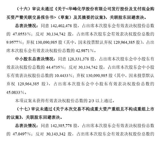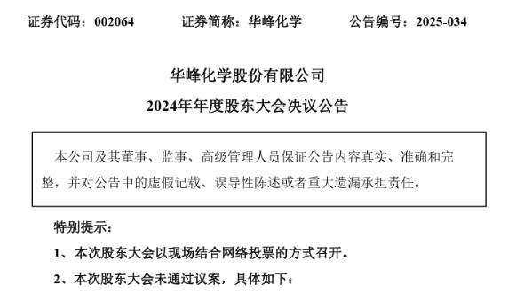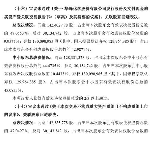 华峰化学(002064)4月30日披露的2024年年度股东大会决议公告显示,本次股东大会未通过议案包括《关于公司发行股份及支付现金购买资产暨关联交易方案的议案》、《关于<华峰化学股份有限公司发行股份及支付现金购买资产暨关联交易报告书>(草案)及其摘要的议案》等共计19个议案。