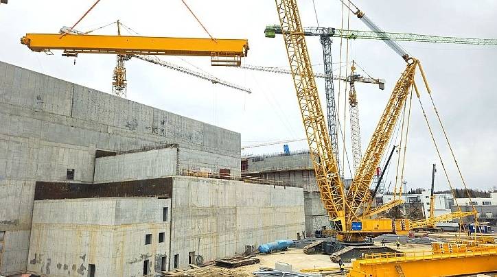 俄罗斯托木斯克州谢韦尔斯克的西伯利亚化学联合企业重达223.5吨的起重机 BREST-OD-300 铅冷快中子反应堆的涡轮机大厅内正在安装。