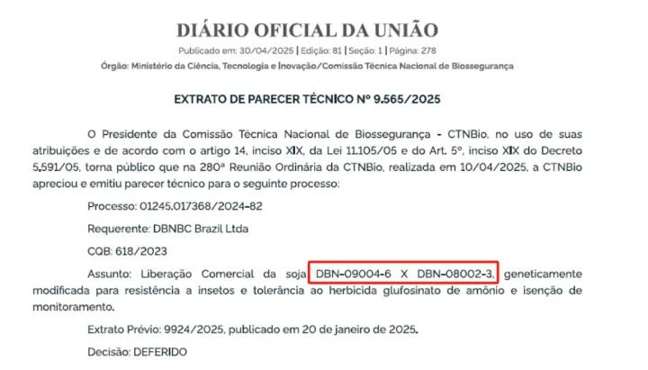 巴西当地时间2025年4月30日,巴西官方网站公布了巴西国家生物安全技术委员会(CTNBio)会议决议,大北农生物研发的转基因抗虫耐除草剂大豆转化事件DBN9004×DBN8002(DBN-09004-6×DBN-08002-3)通过安全评价审查,正式获批种植许可。