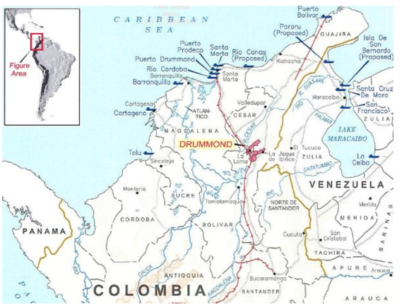 Drummond哥伦比亚煤矿、铁路和港口分布示意图