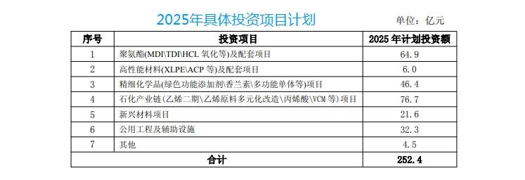 万华化学2025年主要项目计划投资252.4亿元。重点建设MDI扩能一体化配套项目,全年聚氨酯及配套项目计划投资64.9亿元;完善石化产业链,重点完成100万吨/年乙烯原料多元化技改及乙烯二期项目建设,全年石化产业链计划投资76.7亿元。加快自主研发的绿色功能添加剂、香兰素、营养品等一系列营养科技产品的工业化建设,全年精细化学品项目计划投资46.4亿元;持续打造公司第二增长曲线,加快磷酸铁锂、PVDF等一系列电池材料等项目建设,全年新兴材料项目计划投资21.6亿元。