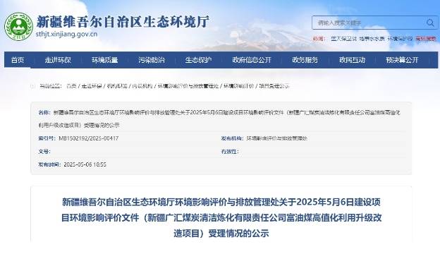 5月6日,新疆维吾尔自治区生态环境厅发布对新疆广汇煤炭清洁炼化有限责任公司富油煤高值化利用升级改造项目环境影响评价文件受理情况的公示。