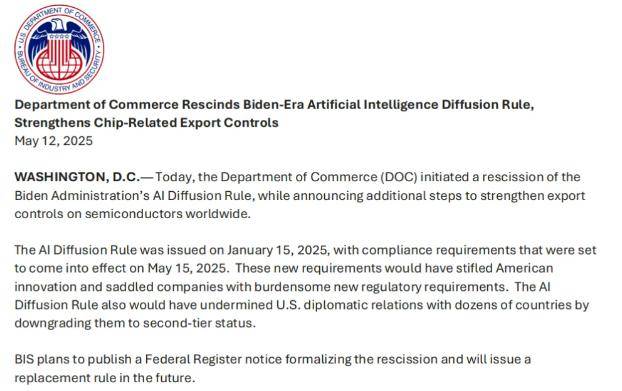 当地时间 5 月 13 日,美国商务部正式发文,废除拜登政府此前推出的《人工智能扩散规则》(AI Diffusion Rule),并同时宣布一系列强化全球半导体出口管制的新措施。这一举动在全球科技产业引发震动,凸显美国在人工智能和半导体领域战略的重大调整。