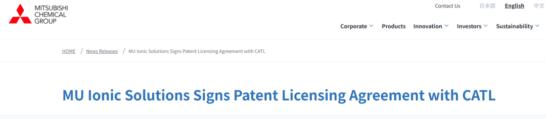 5月15日,三菱化学宣布,其子公司MU Ionic Solutions Corporation(MUIS)已与宁德时代(CATL)签订了专利许可协议,可获取MUIS的锂离子电池 (LIB) 相关专利。