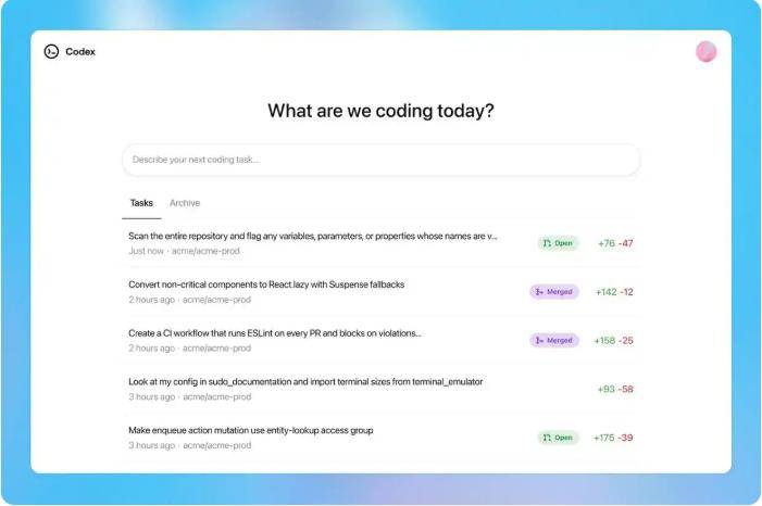 Codex 的每一次会话都在独立的云容器中运行,预加载相关代码库,确保环境隔离。AI 智能体能读取和修改文件、运行测试、执行 linters 或类型检查器等命令,并记录执行结果。