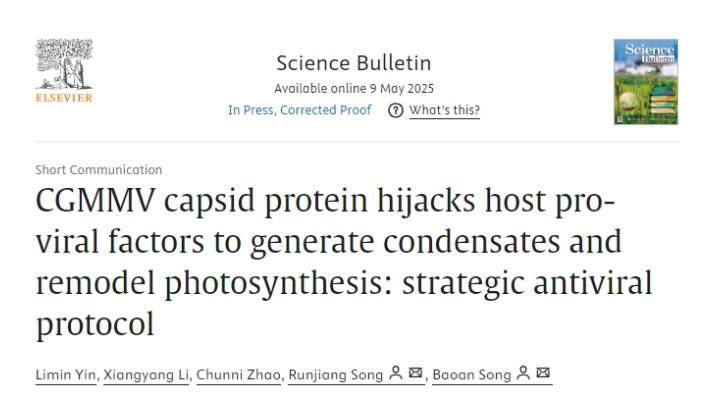 近期,贵州大学绿色农药全国重点实验室根据″靶向植物病毒致病蛋白″策略,成功发现一种小分子C1抑制剂,该化合物作用于CGMMV-CP的特定氨基酸位点,对凝聚体具有破坏作用,从而干扰了病毒粒子的形成。2025年5月9日,在国际知名学术期刊《Science Bulletin》(影响因子18.8) 上在线发表″CGMMV capsid protein hijacks host pro-viral factors to generate condensates and remodel photosynthesis: strategic antiviral protocol″为题的研究论文。