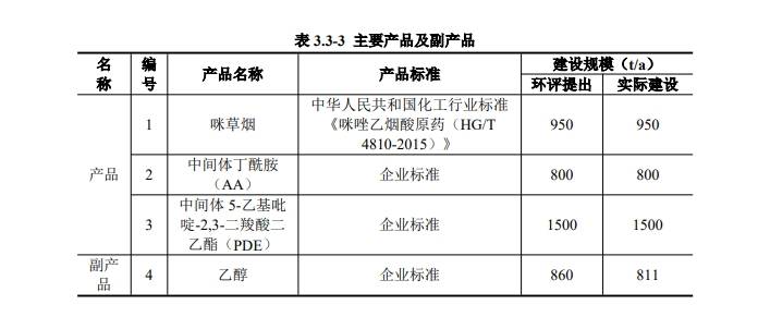 内蒙古新农基科技有限公司3000吨年绿色高效低毒除草剂原药及3500吨年化工中间体项目分两阶段建设,一阶段工程已于2023年12月完成环保验收,主要建设年产烟嘧磺隆原药750吨、中间体磺酰胺1200吨。二阶段主要产品为咪草烟原药950吨/年、甲氧咪草烟原药200吨/年、甲基咪草烟原药100吨/年、烟嘧磺隆原药1000吨/年、中间体丁酰胺(AA)800吨/年、中间体5-乙基吡啶-2,3-二羧酸二乙酯(PDE)1500吨/年,其中年产950吨/年的咪草烟生产线已经建设完成,并进行试生产。