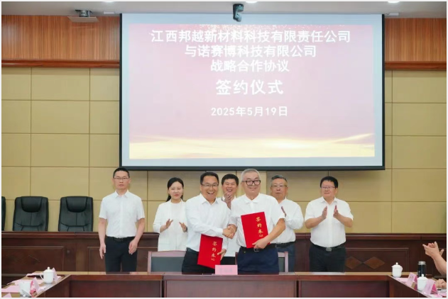 2025年5月19日,在江西龙南市,三孚新科旗下邦越新材与欧洲储能科技企业诺赛博(Noceb Tech AB)正式签署战略合作协议,双方将就半固态高安全电池关键材料进行产业化合作,共建联合检测实验室。