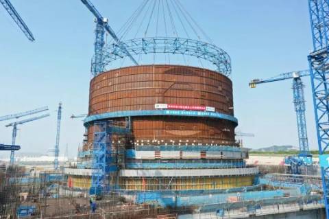 5月25日7时58分,石岛湾核电扩建一期工程1号机组反应堆钢衬里模块五吊装就位。