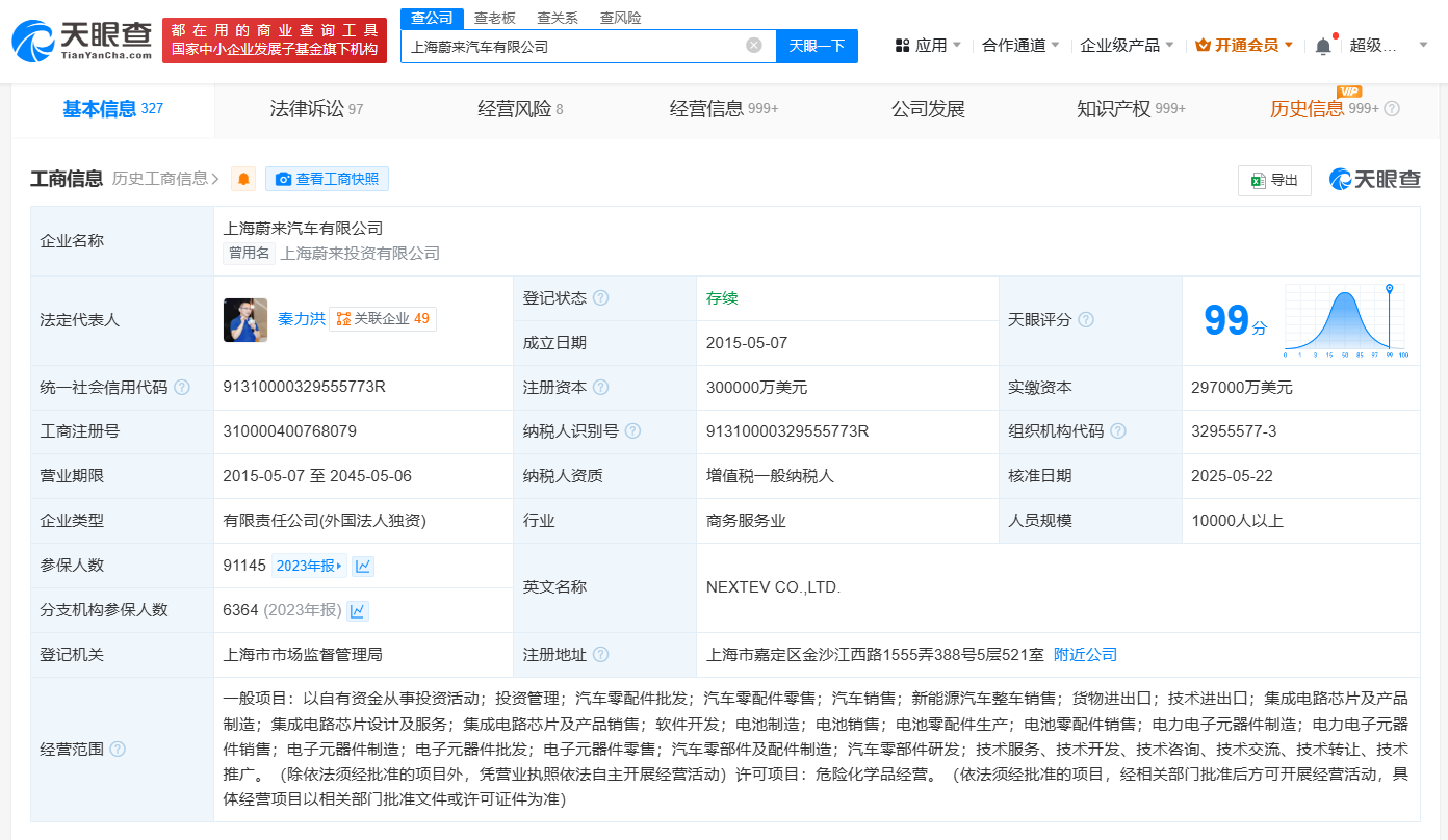 天眼查App显示,近日,上海蔚来汽车有限公司发生工商变更,经营范围新增电池制造、电池销售、电池零配件生产等。该公司成立于2015年5月,法定代表人为秦力洪,注册资本30亿美元,由蔚来控股有限公司全资持股。