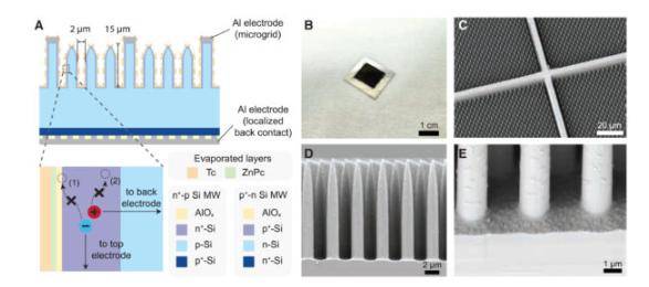该界面还包含一层薄氧化铝 (AlO x ) 钝化层,用于防止转移的载流子在硅表面立即复合,以及一层作为电子给体材料的锌酞菁 (ZnPc) 层。“为了最大限度地减少背面的复合,我们添加了一个结深为 1 μm 的背表面场 (BSF) 层和一个局部背接触,”科学家们说道。“我们采用微网格电极作为正面电极,以有效地收集载流子。”