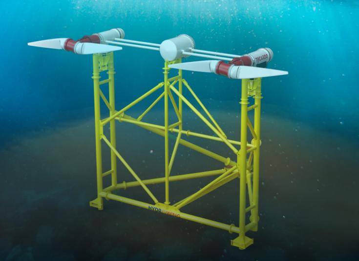 HydroWing 是一种简单、经济高效的潮汐能发电方法。它由一个位于海床上的结构和安装有涡轮机的“翼”组成,涡轮机可轻松降下到位。 这些涡轮机 双向运转,利用涨潮和退潮发电,而且批量生产成本低廉。