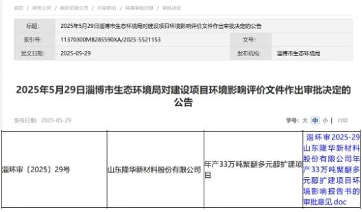 5月29日,淄博市生态环境局官网发布了对“山东隆华新材料股份有限公司年产33万吨聚醚多元醇扩建项目”作出审批决定的公告,同意该项目按申报工艺、规模、地点和污染防治措施等进行建设。
