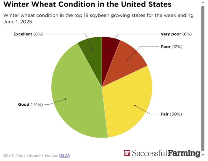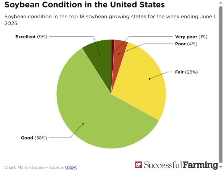 截至6月1日,全美18个州的大豆作物已出苗63%,高于五年平均水平57%。