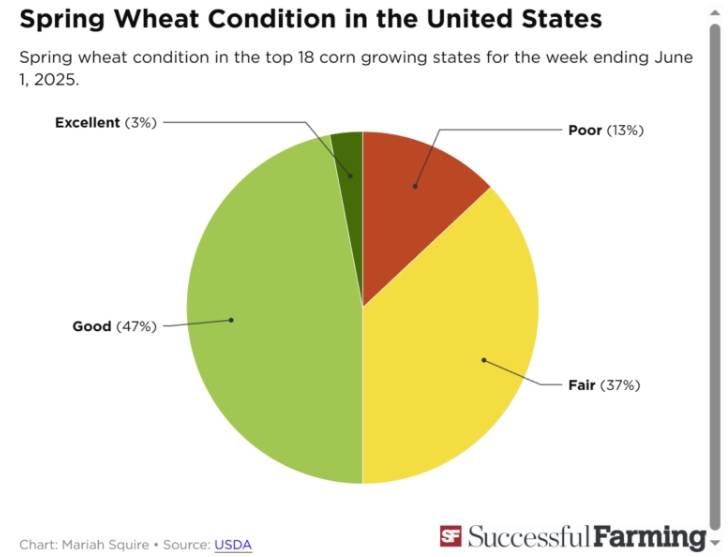 在六个春小麦种植最多的州,截至 6 月 1 日,95% 的作物已经种植完毕。这高于五年平均水平的 90%。