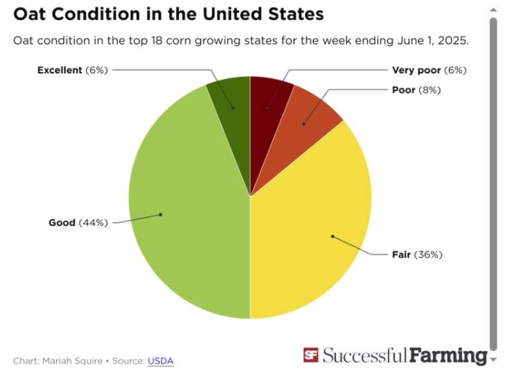 截至 6 月 1 日,全美九个州的燕麦作物出苗率已达 86%,比五年平均水平高出 2 个百分点。